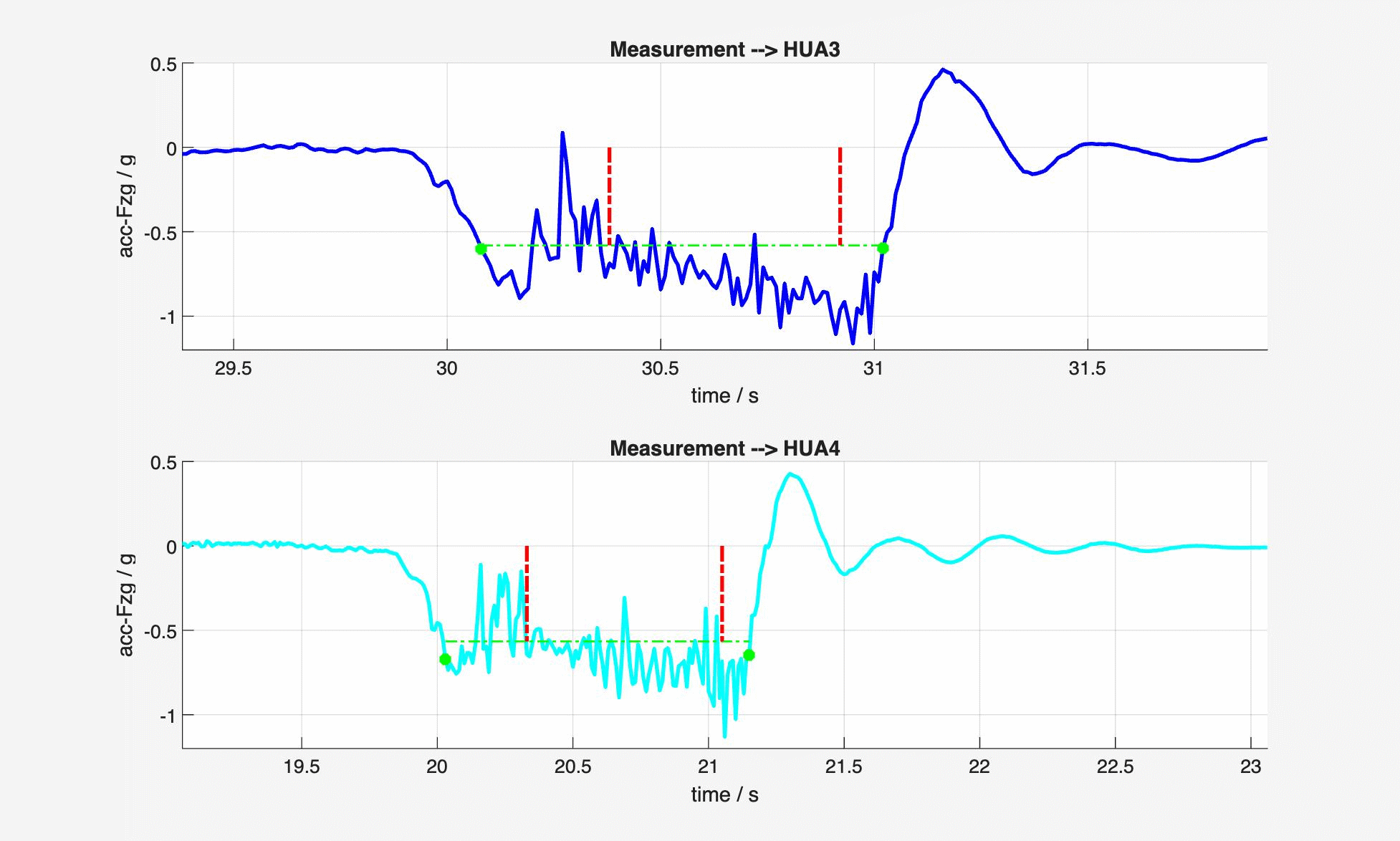 Um laut MAHA-Formel die mittlere Vollverzögerung zu bestimmen, wird zunächst der Wert der maximalen Verzögerung (minimale Beschleunigung gesucht. Dies kann beispielsweise mit der Funktion a_min = min() erfolgen. Danach ist der Bereich einzugrenzen. Dazu ist beispielsweise die Unterschreitung unter den halben Wert des Minimalwertes a_min/2 mit der Funktion find() nutzbar. Die weitere Eingrenzung der unteren und oberen Schwelle erfolgt durch Addition von 30 auf den ersten Index und Subtraktion von 10 auf den zweiten Index (Abtastzeit ist 0,01 s). Sowohl für die 3. Messung (HUA3) als auch die 4. Messung (HUA4) ist es in der nachfolgenden Grafik für alle Messungen vorgenommen worden.